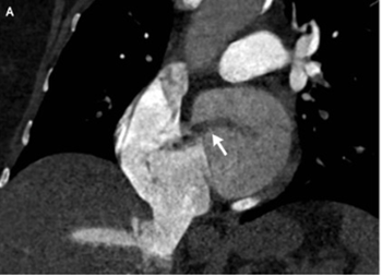 造影CTが施行され、肺動脈における肺塞栓、右心拡張、これまで知られていなかった卵円孔開存(PFO:patent foramen ovale)が認められた。