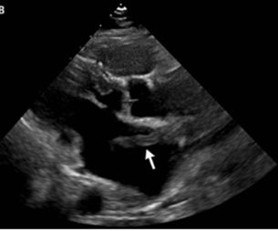 心エコーでは血栓が卵円孔を通って、左心房にまさに通過しているところが示された。