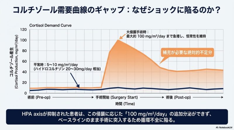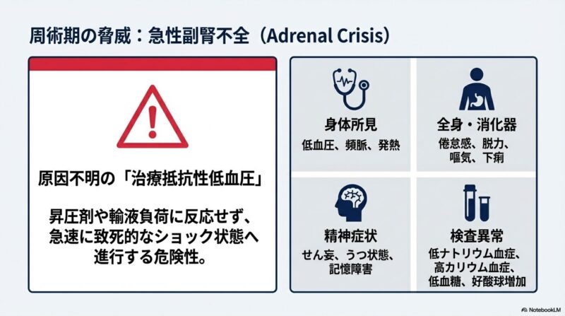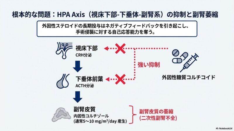 ステロイド長期投与患者における周術期管理は、外科手術や麻酔の現場において極めて重要です。長期間の薬剤使用により、体内の「HPA系(視床下部-下垂体-副腎皮質系)」が抑制されると、自力で十分なコルチゾールを分泌できなくなり、手術侵襲をきっかけに治療抵抗性の低血圧やショックを伴う「急性副腎不全」に陥る危険があるためです。