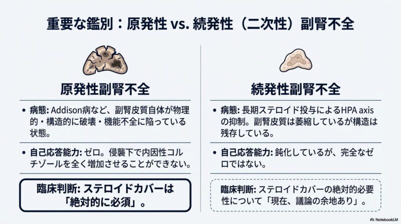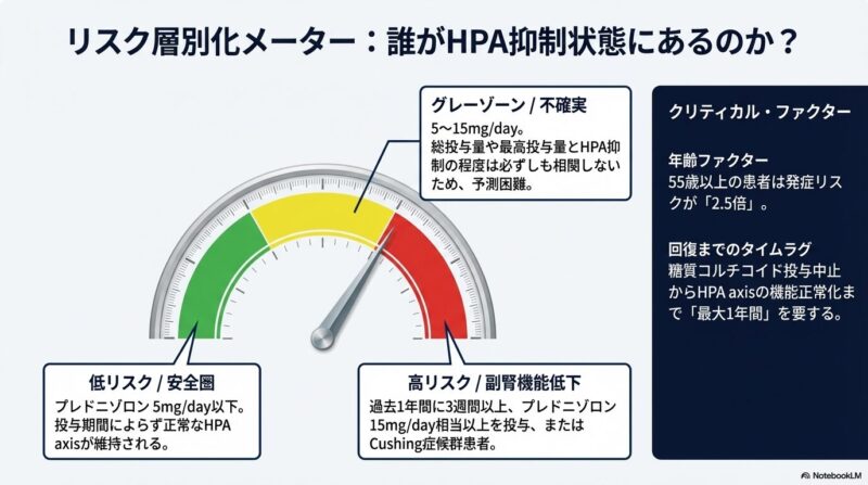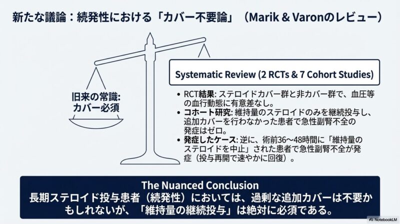 特に注意が必要なのは、過去1年間にプレドニゾロン換算で15mg/day以上を3週間以上服用していたケースですが、投与量と副腎の抑制程度は必ずしも相関しないため、正確な予測は困難です。一方で、維持量のステロイドさえ継続すれば追加のカバーは不要とする報告もあり、最適なレジメンについては今なお議論が続いています。