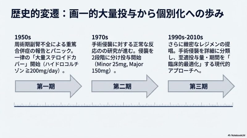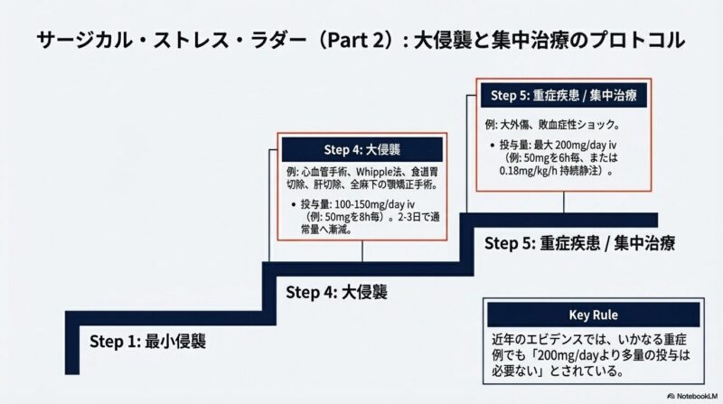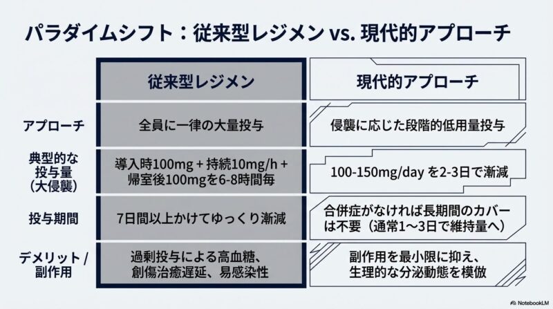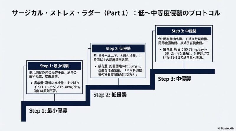 これまでの臨床では、一律に大量のステロイドを補充する「ステロイドカバー」が主流でしたが、近年は高血糖や感染症、創傷治癒遅延といった副作用を避けるため、手術の負荷(低・中・高侵襲)に応じた「段階的低用量ステロイドカバー」へと移行しています。具体的には、小手術なら25mg、開腹手術などの中侵襲なら50〜75mg、心臓手術などの大侵襲では100〜150mgのハイドロコルチゾンを投与し、術後数日で速やかに通常量へ戻すスケジュールが提唱されています。