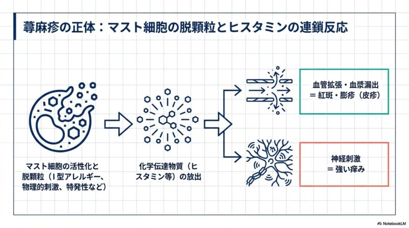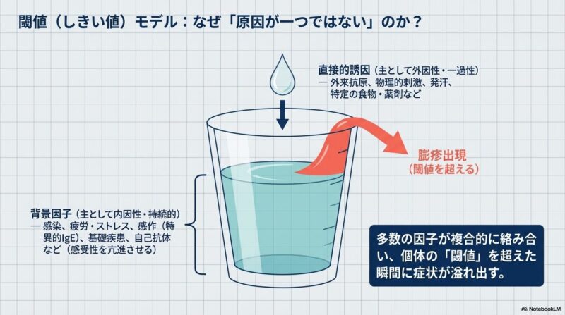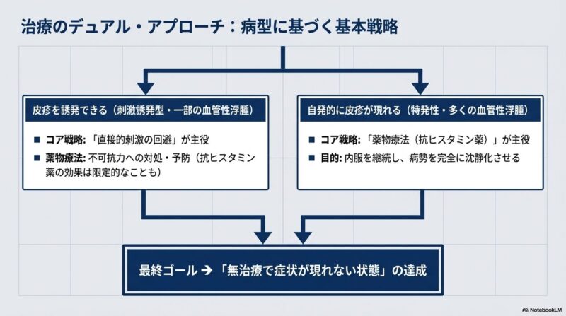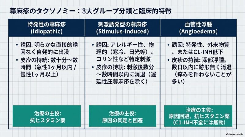 診断において最も重要なのは丁寧な問診であり、個々の皮疹が通常24時間以内に消退することが大きな特徴です。原因は特定の食物や薬剤に対するアレルギー反応だけでなく、機械的擦過、寒冷、日光などの物理的刺激、あるいは発汗に伴うコリン性蕁麻疹など多岐にわたりますが、特に慢性例では原因の特定が困難な「特発性」が大部分を占めます。そのため、全症例に一律の血液検査(I型アレルギー検査など)を行うことは推奨されておらず、病歴に基づき必要な検査を絞り込むことが大切です。