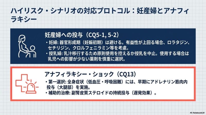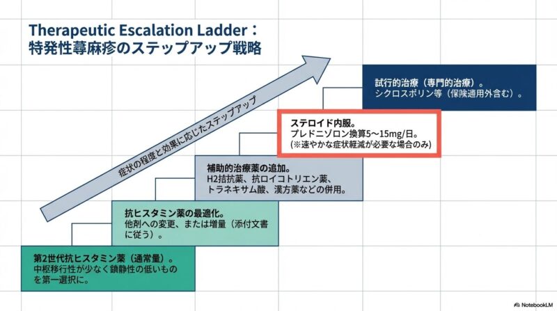 既存の治療でコントロール困難な難治例には、H2拮抗薬やロイコトリエン受容体拮抗薬の併用、さらに重症例ではオマリズマブ(抗IgE抗体)やシクロスポリンといった免疫学的治療も選択肢となります。また、唇や瞼が腫れる血管性浮腫や、息苦しさを伴うアナフィラキシーショックなどの緊急時には、アドレナリン投与を含む迅速な救急処置が必要です。