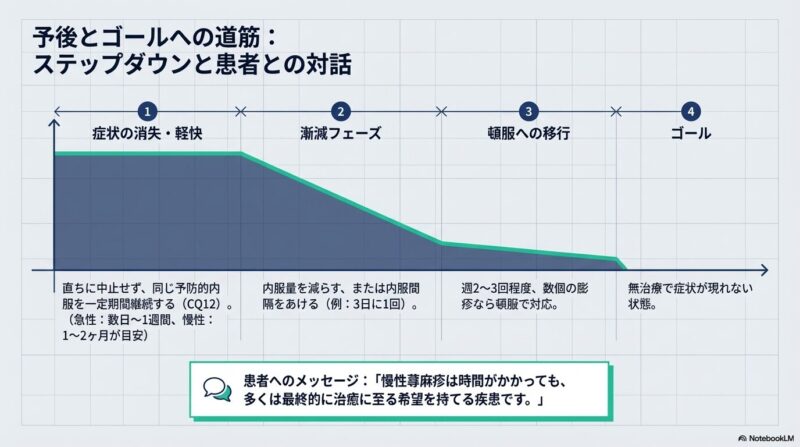 治療の基本は、原因や悪化因子の除去と、第2世代抗ヒスタミン薬を中心とした薬物療法です。この薬剤は、従来の薬に比べて眠気などの副作用(鎮静作用)が少なく、第一選択薬として推奨されています。通常量で効果不十分な場合は、薬剤の変更や増量を検討します。慢性蕁麻疹のゴールは、症状がない状態を維持し、最終的に薬なしで過ごせるようにすることです。そのため、皮疹が消えてもしばらくは内服を続ける「予防的投与」を行い、徐々に減量していく戦略が有効です。