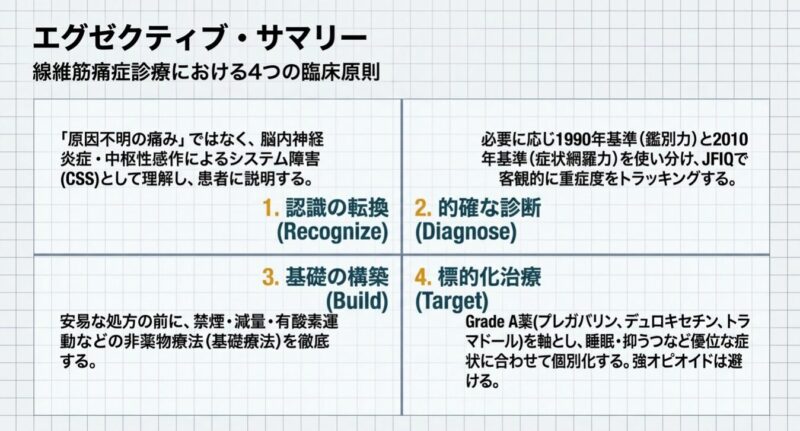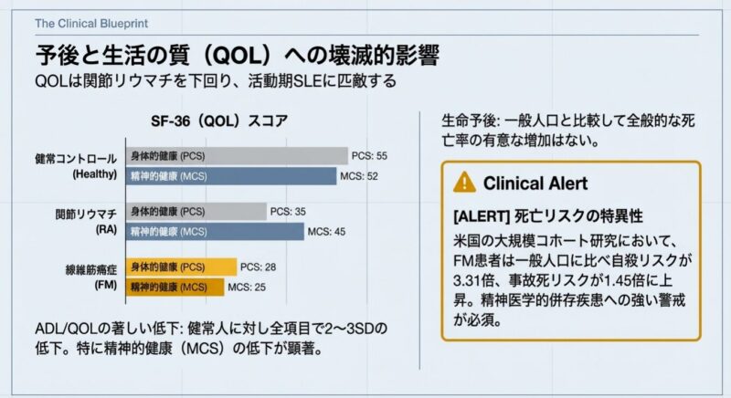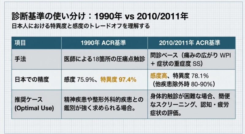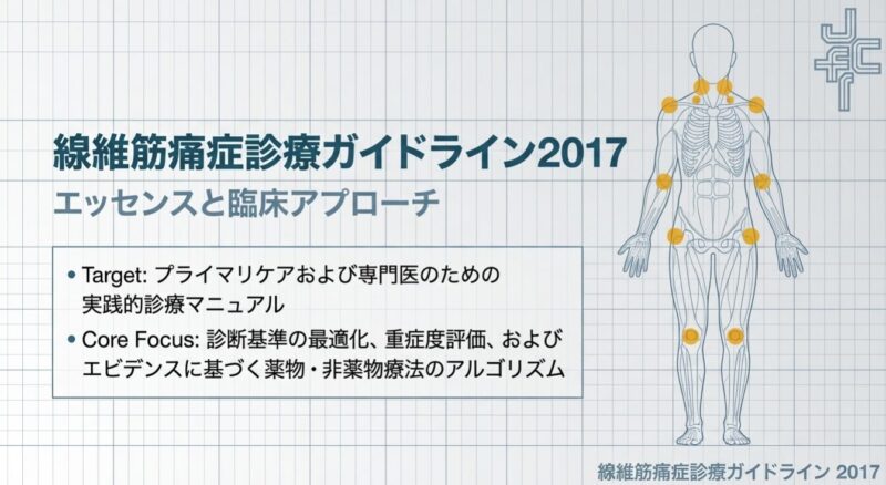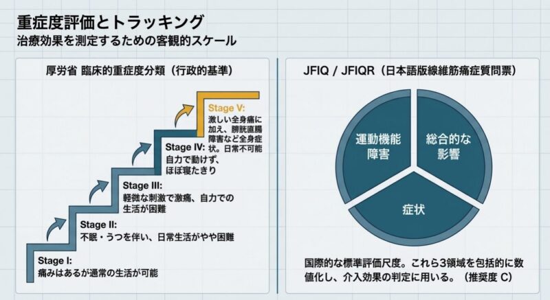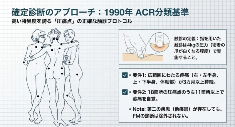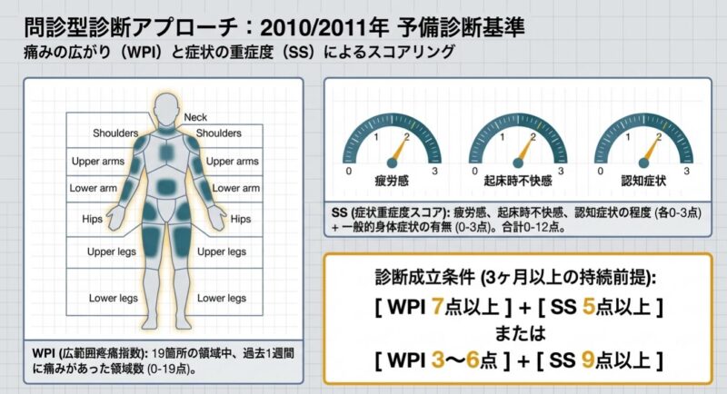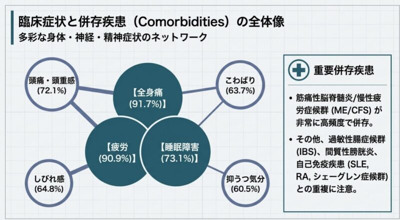 診断には、全身18箇所の圧痛点を評価する1990年の分類基準や、痛みの広がり(WPI)と症状の重症度(SSスコア)を用いる2010年以降の診断基準が活用されます。主な随伴症状として、睡眠障害、強い疲労感、うつ状態、認知障害、過敏性腸症候群(IBS)などを高頻度に併存し、生活の質(QOL)は著しく低下します。
