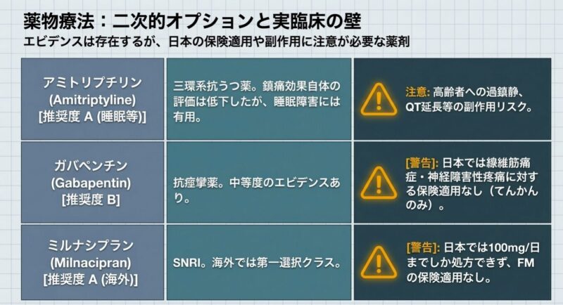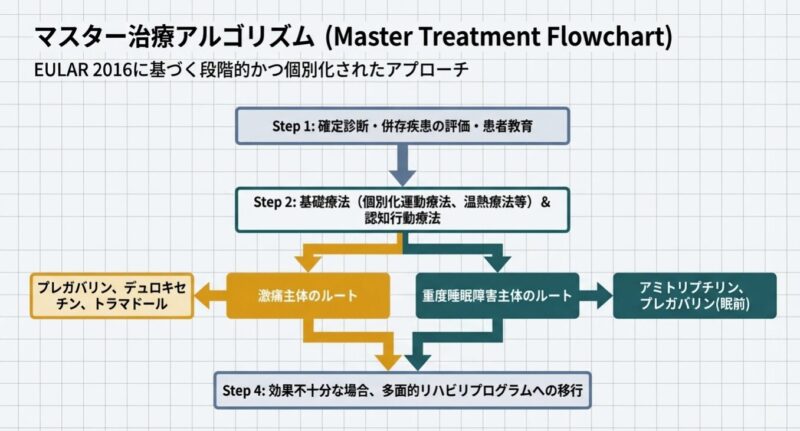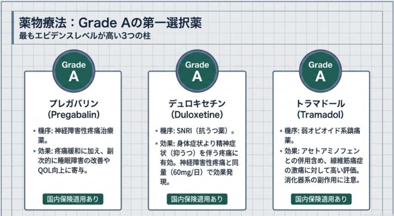 治療は薬物療法と非薬物療法を組み合わせた「個別化治療」が基本となります。薬物療法では、プレガバリン(リリカ)デュロキセチン(サインバルタ)、トラマドールなどの有効性が高く推奨されています。一方で、一般的な解熱鎮痛薬(NSAIDs)やステロイドは、線維筋痛症そのものの痛みには効果が乏しいとされています。