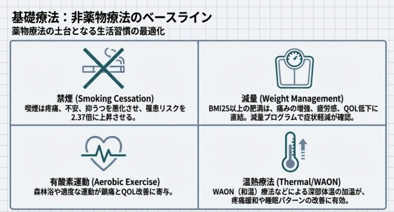 非薬物療法では、段階的な有酸素運動や認知行動療法(CBT)、鍼治療、温泉療法などが有効です。FMは目に見えない障害であるため、医療者との信頼関係構築や周囲の理解が欠かせません。長期療養の際には、障害年金や身体障害者手帳などの公的保障制度の活用、さらに患者会による情報共有を含めた多角的なサポートが重要です。