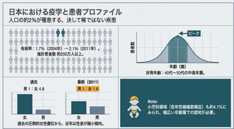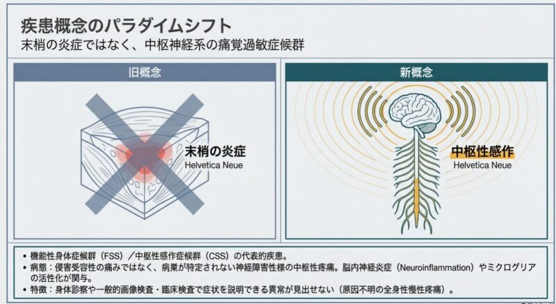 線維筋痛症(FM)原因不明の慢性疼痛と全身性のこわばりを主徴とする機能性身体症候群(FSS)です。わが国の有病率は人口の約1.7〜2.1%(推定200万人以上)と比較的頻度が高く、特に中年女性に好発する傾向があります。病態の核心は、脳が痛みに対して過敏になる中枢性感作症候群(CSS)と考えられており、身体診察や一般的な画像検査、血液検査では異常を見出せないのが特徴です。