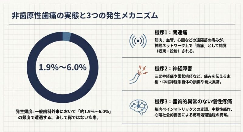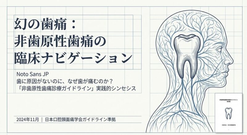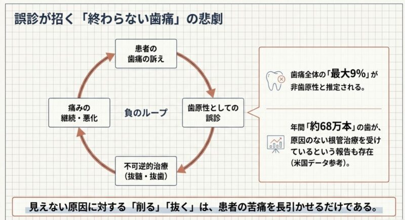 非歯原性歯痛とは、むし歯や歯周病など歯そのものに原因がないにもかかわらず、歯に痛みを感じる疾患の総称です。歯科外来を訪れる患者の約2%程度に認められると推定されていますが、最大の臨床的問題は、誤診によって抜髄(歯の神経を取る)抜歯といった不可逆的な歯科治療が行われてしまうことです。これらの歯科処置は非歯原性の痛みに対しては全く無効であり、むしろ症状を悪化させることさえあります。