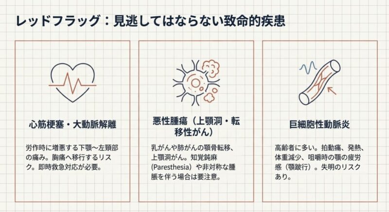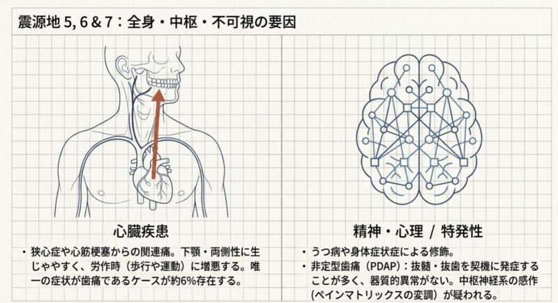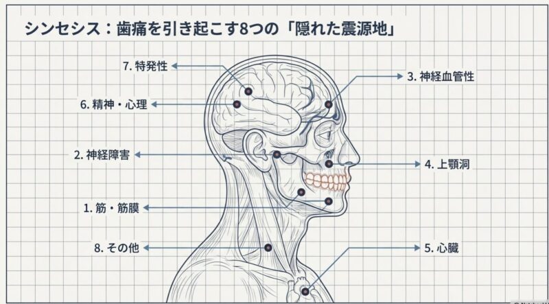 - 心臓疾患: 狭心症や心筋梗塞の関連痛。歯痛が唯一の症状である場合もあり、見逃すと生命に関わります。