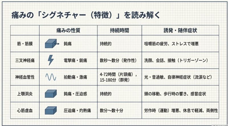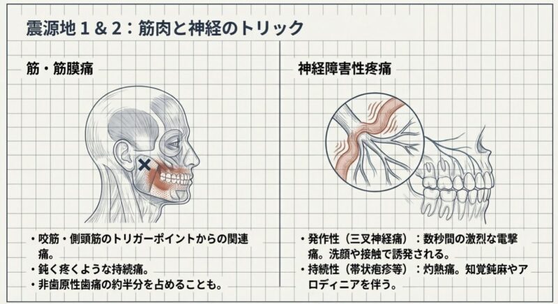 - 筋・筋膜痛: 咬筋や側頭筋など、噛む筋肉のコリ(トリガーポイント)から生じる関連痛。