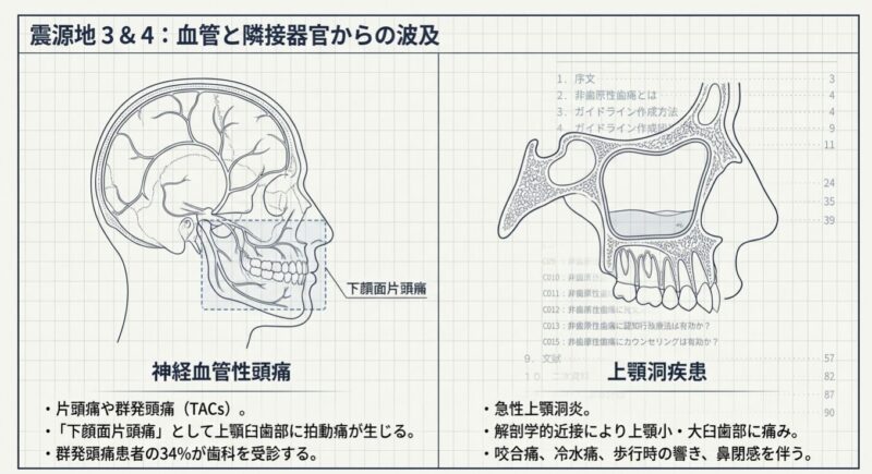 - 神経血管性頭痛: 片頭痛や群発頭痛に伴う歯の痛み。