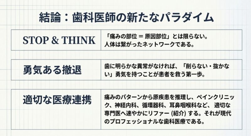 診断においては、詳細な問診と検査で歯に異常がないことを確認することが不可欠です。当該歯に局所麻酔を打っても痛みが改善しない場合は、非歯原性である可能性が高まります。治療は原因ごとに異なり、三叉神経痛にはカルバマゼピン、非定型歯痛にはアミトリプチリンなどの三環系抗うつ薬や心理療法が検討されます。原因不明の歯痛に悩む患者に対し、安易に歯を削るのではなく、適切な診療科への紹介を含めた多角的なアプローチが推奨されています。柏市や我孫子市にお住いの方で歯痛にお困りの方はご気軽にご相談ください。当院は医科とも連携しており、レッドフラッグである巨細胞性動脈炎であるかないかの診断(膠原病領域)など、非歯原性の疼痛管理にも長けています。
