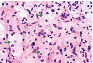 病理では、散在するリンパ球および形質細胞と混合した組織球の浸潤を認めた。