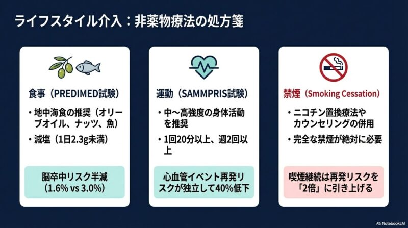 生活習慣の改善も極めて重要です。野菜、果物、オリーブオイルを豊富に含む地中海食への変更や、完全な禁煙、週2回以上の適度な運動は、再発リスクを大幅に軽減します。頸動脈狭窄症がある場合には、外科的な内膜剥離術やステント留置術も考慮されます。脳梗塞後のQOL(生活の質)を維持するためには、これらの多角的なアプローチを早期に導入し、継続的にモニタリングすることが「バイブル」とも言える予防の鉄則です。