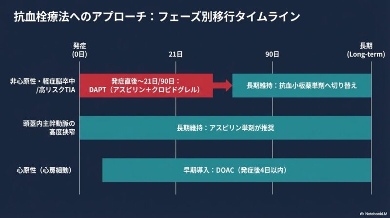 予防戦略の核となるのは、薬物療法と生活習慣の修正です。非心原性の軽症脳梗塞や高リスクの一過性脳虚血発作(TIA)に対しては、発症後早期の21~30日間にわたるアスピリンとクロピドグレルの2剤併用抗血小板療法(DAPT)が、単剤療法よりも高い再発予防効果を示します。一方、心房細動を伴う症例では、出血リスクを抑えつつ脳梗塞を防ぐために、直接経口抗凝固薬(DOAC)が第一選択として推奨されています。
