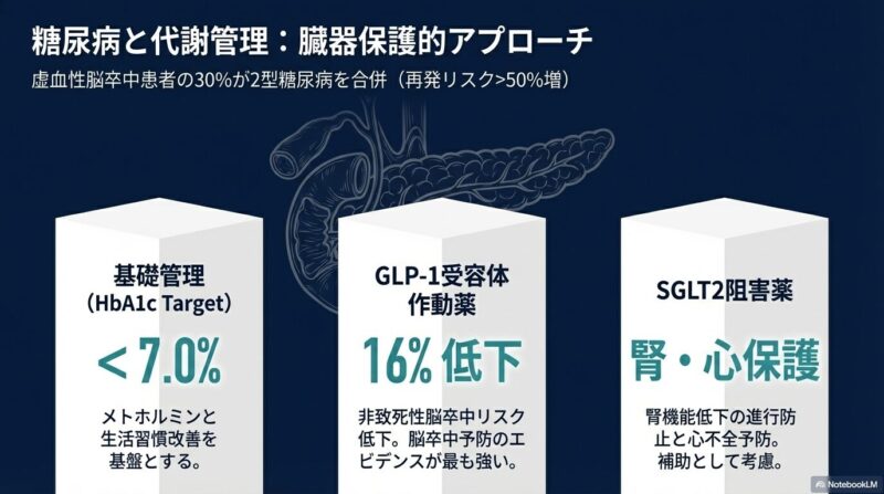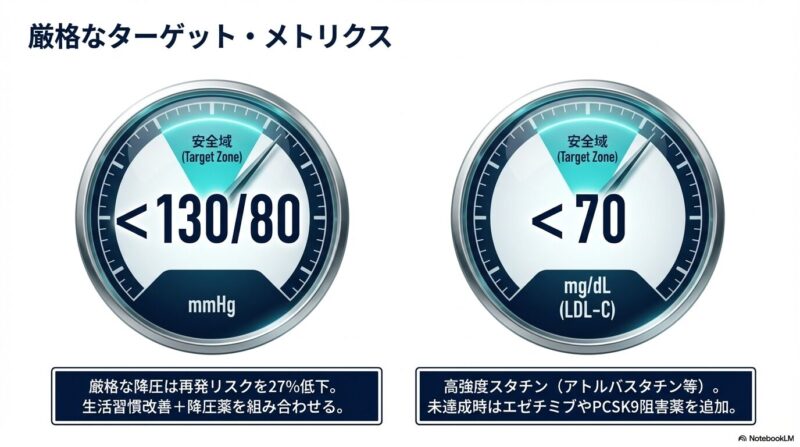 リスク管理において、高血圧の治療目標は一般に130/80 mmHg未満とされ、厳格な管理が再発率を低下させます。脂質管理では、高用量スタチンを用いてLDLコレステロール値を70 mg/dL未満に制御することが目標です。また、糖尿病患者では、脳卒中予防効果が期待できるGLP-1受容体作動薬の併用が検討されます。