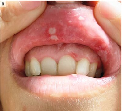 口腔内に口唇と歯肉にアフタ性潰瘍を複数認めた。