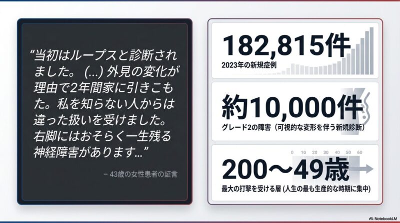ハンセン病(Hansen’s disease)身体障害や外見の変化、それに伴う深刻な社会的スティグマを引き起こします。