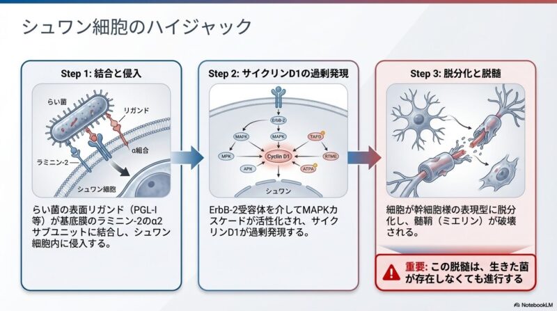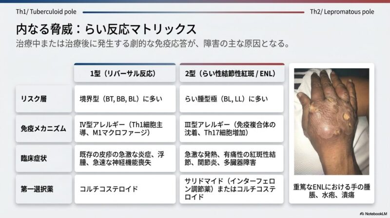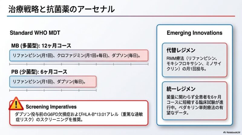治療戦略の柱は、1981年に導入されたリファンピシン、ダプソン、クロファジミンによるWHO推奨の**多剤併用療法(MDT)**です。現在は、治療期間をさらに短縮するための新規レジメン(リファンピシン、モキシフロキサシン、ミノサイクリンの併用など)や、ベダキリンといった新薬の転用についても臨床研究が進められています。また、治療中や治療後に生じる急激な免疫反応(らい反応)は、神経機能の急速な喪失を招くため、ステロイド等による早期の炎症管理が不可欠です。