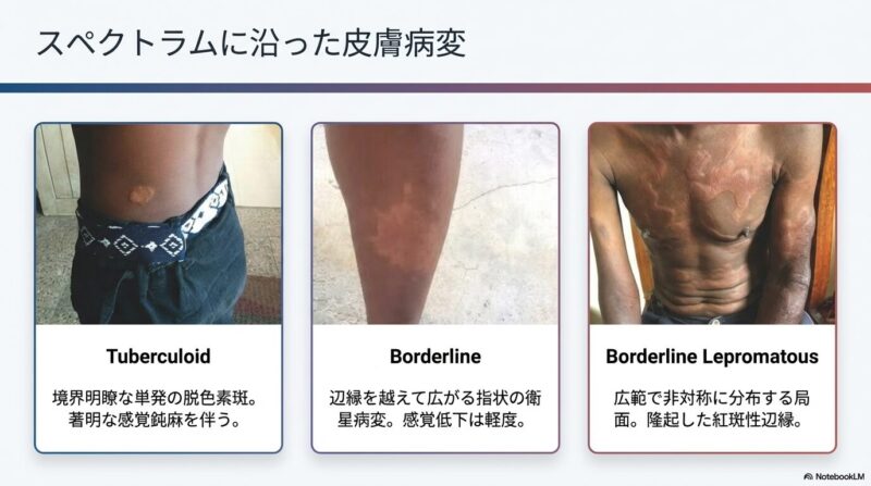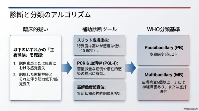 診断においては、(1)知覚低下を伴う特徴的な皮膚病変、(2)末梢神経の肥厚、(3)スリットスキン抹消検査での菌検出、という3つの主徴が重要です。近年では、菌量が少なく診断が困難な「少菌型(PB)」に対し、PCR検査によるDNA検出や、特異的な抗体(抗PGL-I抗体)を用いた血清学的診断を組み合わせることで、診断精度の向上が図られています。