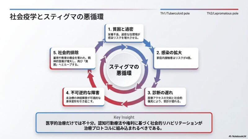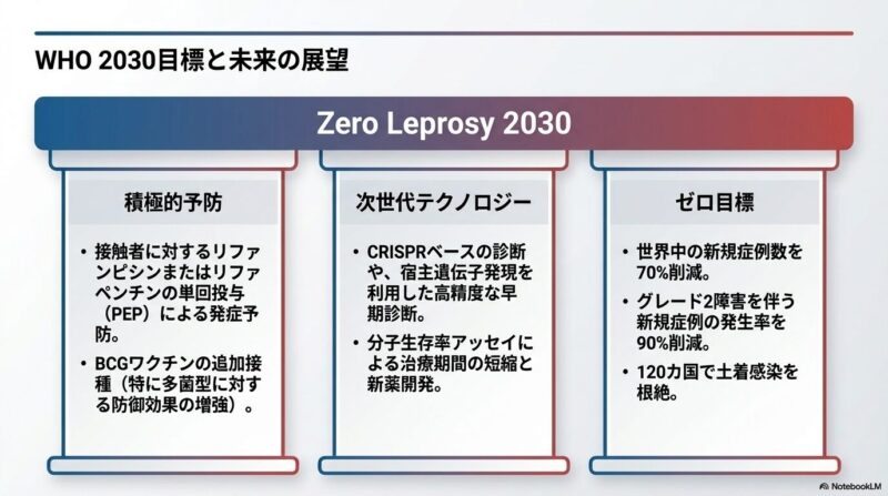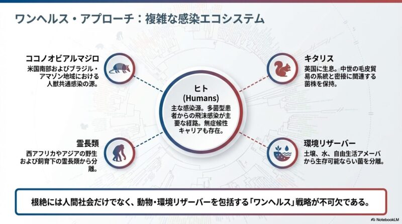 予防と根絶に向けては、患者の接触者に対するリファンピシンの単回投与(SDR)や、BCGワクチンの追加接種が有効な**ポストエキスポージャー・プロフィラキシス(PEP)**として推奨されています。さらに、米国でのアルマジロや英国での赤リスといった野生動物からの感染例が報告されており、ヒト・動物・環境の健康を一体で捉える「ワンヘルス」アプローチの重要性が強調されています。2030年までの「ハンセン病ゼロ」達成には、医療的介入と並行して、差別的な法律の撤廃や患者の社会復帰支援といった人権ベースの取り組みが不可欠です。