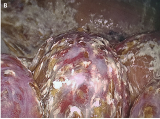また腹膜と炎症を起こした腸管膜とのあいだの癒着も見られた。