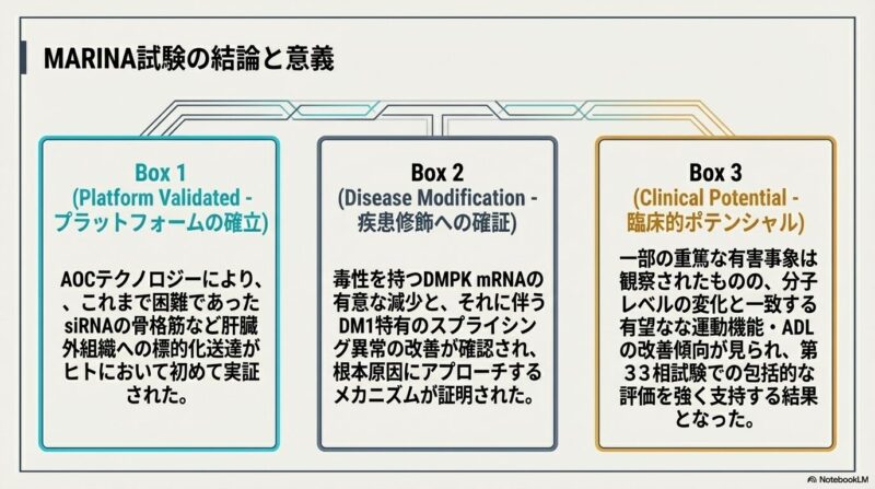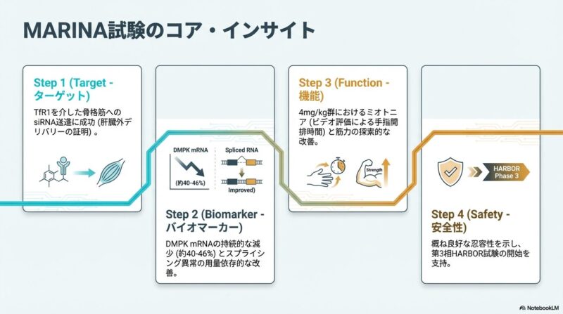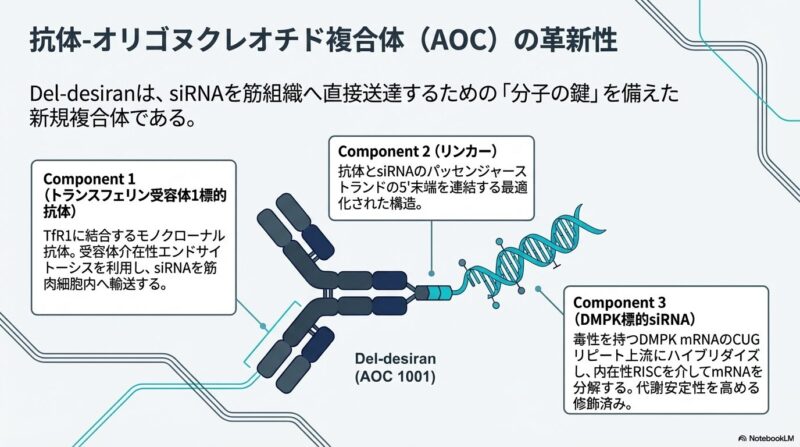 今回の第1・2相臨床試験(MARINA試験)では、世界初の抗体オリゴヌクレオチド抱合体(AOC)デルパシバート・エテデシラン(del-desiran [AOC 1001])siRNAを結合させたもので、これまで困難とされてきた筋肉組織への効率的な薬剤送達を実現しています。