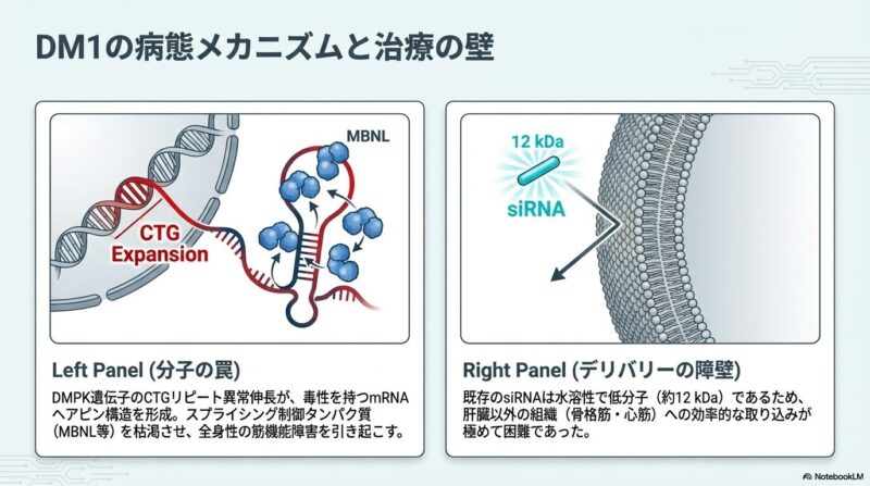 筋強直性ジストロフィー1型(DM1)は神経筋疾患です。この異常によって毒性を持つメッセンジャーRNA(mRNA)が生成され、RNAスプライシングの調節不全(ミススプライシング)が生じることで、筋力の低下や筋肉の弛緩が遅れるミオトニア(筋強直)などの多様な症状を呈し、現在のところ根本的な治療法は存在しません。