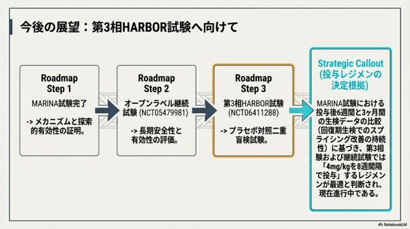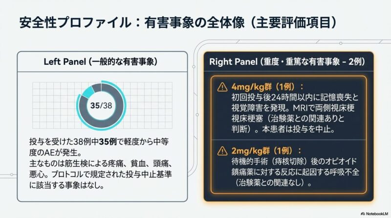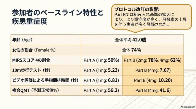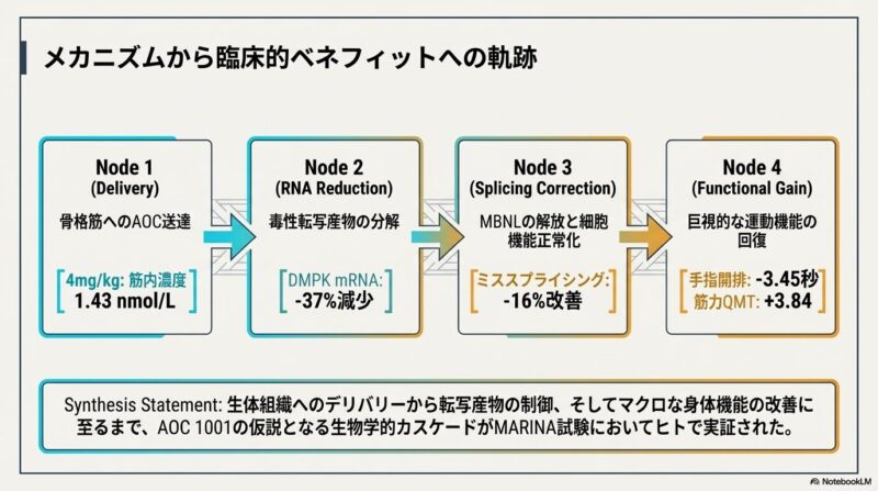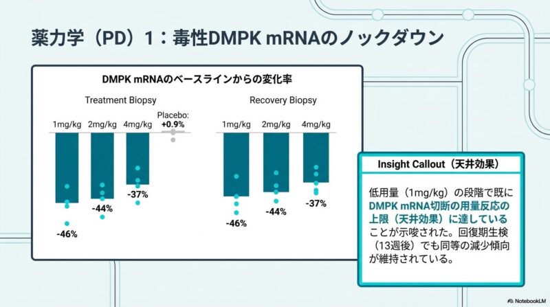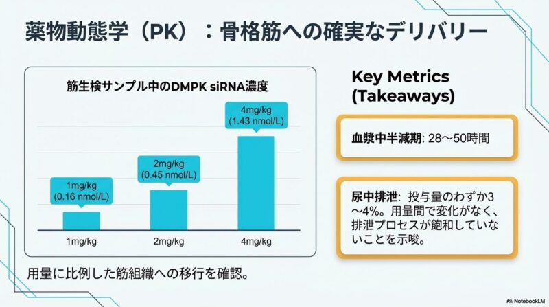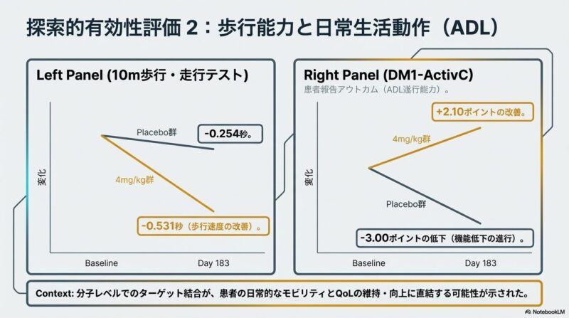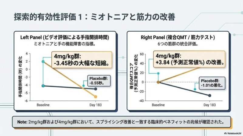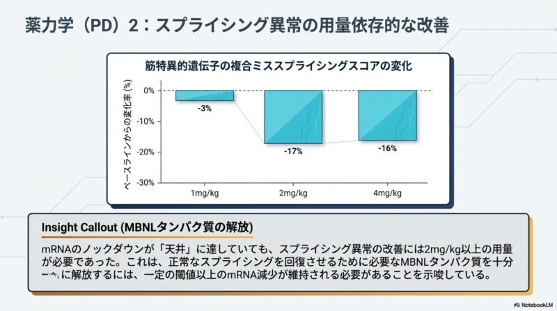 試験の結果、デルパシバート・エテデシラン投与群では、プラセボ群と比較して筋肉内のDMPK mRNAレベルが約37~46%減少しました。また、2mg/kg以上の用量でスプライシング異常の改善が認められ、探索的な評価項目では手を開く速さ握力10メートル歩行テストなど、患者の身体機能の改善を示唆するデータも得られています。