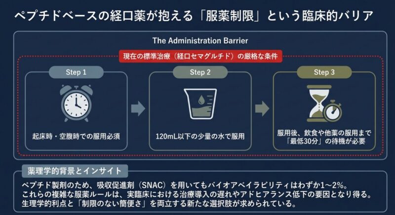 2型糖尿病治療において、GLP-1受容体作動薬は優れた血糖降下および体重減少効果により不可欠な存在ですが、その多くは皮下注射製剤です。唯一の経口薬であるセマグルチド(リベルサス🄬)も、吸収を維持するために服用前後の飲食制限が必要という課題がありました。今回、飲食制限の不要な新規の非ペプチド型経口GLP-1受容体作動薬オルフォルグリプロン (orforglipron)の有効性と安全性が、既存の経口セマグルチドと直接比較した国際共同第3相臨床試験「ACHIEVE-3」で報告されています。