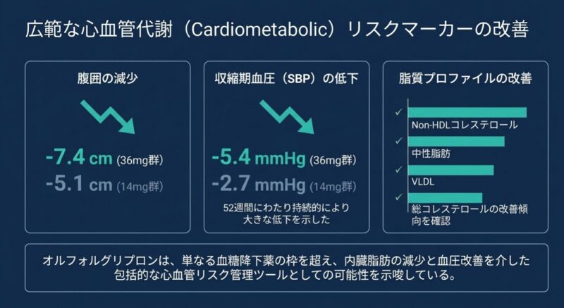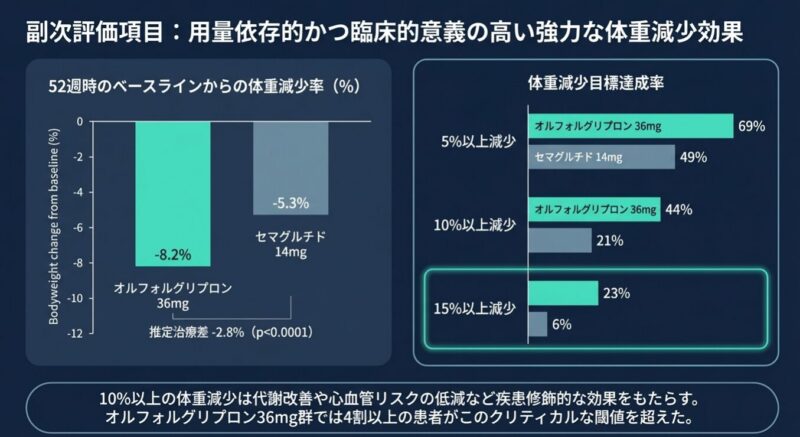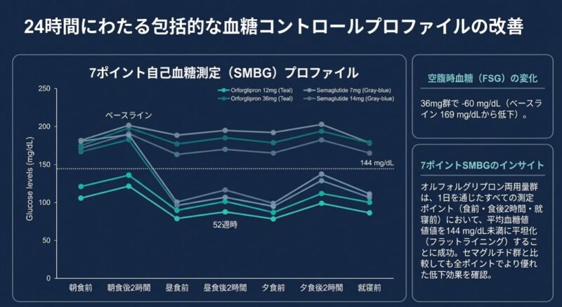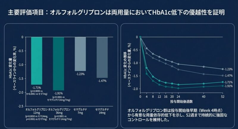 メトホルミンで血糖コントロールが不十分な成人患者約1,700名を対象とした52週間の試験において、オルフォルグリプロン(12mgおよび36mg)は、経口セマグルチド(7mgおよび14mg)に対して、主要評価項目であるHbA1cの低下量で非劣性を示しただけでなく、統計的に有意な優越性を証明しました。また、体重減少においてもオルフォルグリプロン群でより大幅な改善が認められ、臨床的に意義のある5〜15%以上の減量を達成した割合も対照群を上回りました。