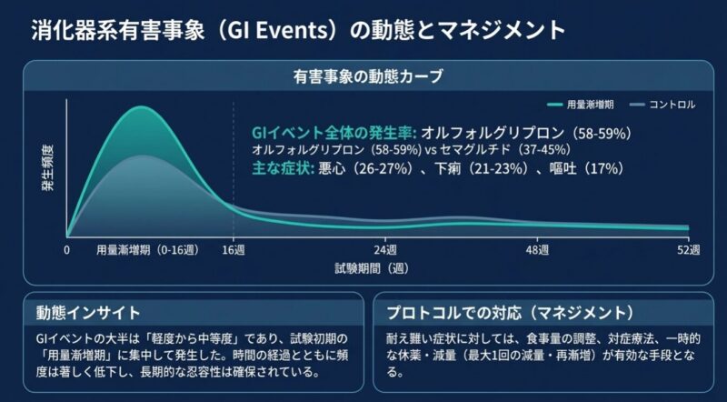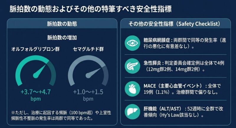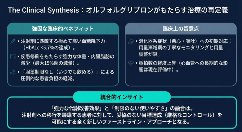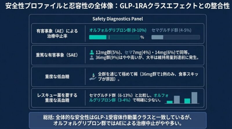 副作用については、両薬剤ともにGLP-1受容体作動薬クラスに共通する悪心や下痢などの消化器症状が主でしたが、オルフォルグリプロン群ではセマグルチド群と比較して消化器症状による治療中止率や平均心拍数の上昇がわずかに高い傾向にありました。結論として、オルフォルグリプロンは、注射を必要とせず、かつ服用時の制約がない簡便な経口投与によって、血糖管理と肥満改善を可能にする新たな糖尿病治療薬の選択肢として、今後の普及が見込まれます。