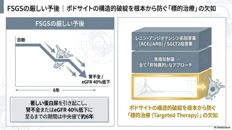 FSGSは比較的まれな疾患ですが、蛋白尿の原因として重要な疾患の一つです。