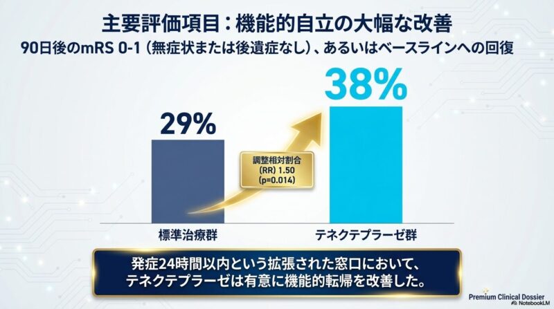 このデータは「従来より回復する人が増えた(良好な回復:38%(従来治療29%)が増えた)」ことを示しています。