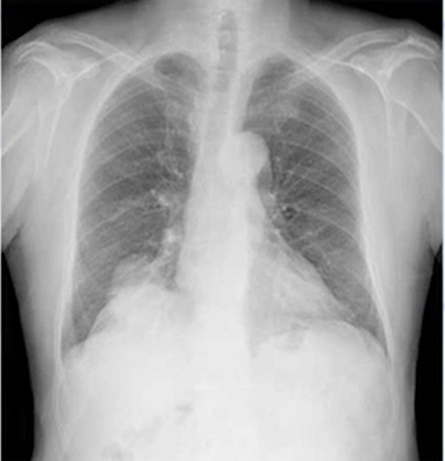 本症例では右下肺野に横隔膜とシルエットサイン陰性(周囲の臓器と離れていることが示唆される)の腫瘤影を認め、横隔膜から離れた肺癌が疑われます。精査へ進めます。