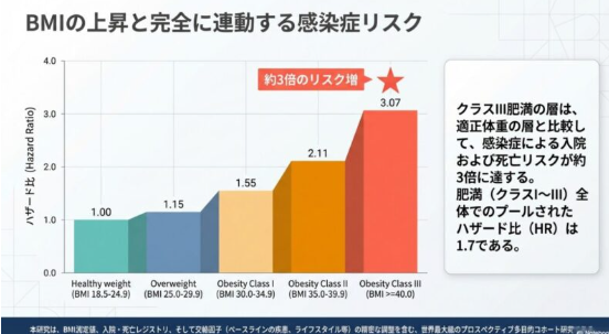 研究では、肥満があることで死亡リスクや病気の発症率が上昇することが分かっています。