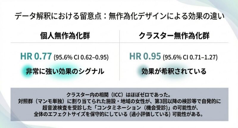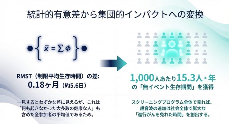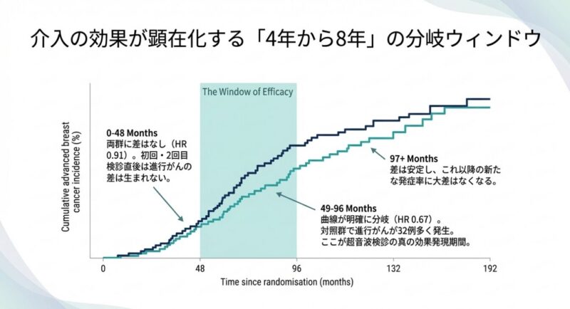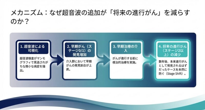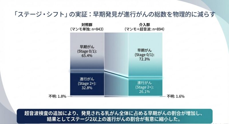 解析の結果、超音波の併用による恩恵は特に検診開始から4〜8年後に顕著に現れており、早期発見(ステージ0または1)の割合が高まることで、将来の重症化を効果的に防いでいることが示唆されました。これは、超音波を組み合わせた検診体制が、特にアジア人女性のように乳腺密度の高い集団において、進行がんを減らすための非常に有力な手段であることを世界で初めて証明した画期的な成果です。