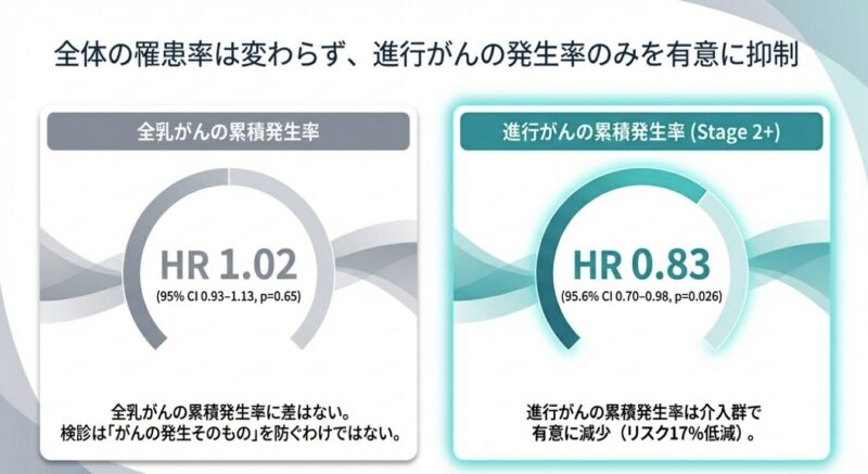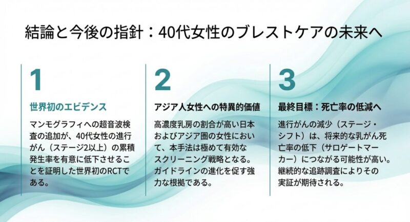 今回の報告は、進行がんの減少が将来的な乳がん死亡率の低下につながる可能性を示す重要なエビデンスであり、今後の乳がん検診ガイドラインの策定に大きな影響を与えることが期待されています。
