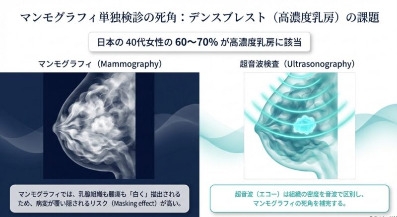 日本の40代女性にとって、乳がんは最も身近で深刻な健康リスクであり、40歳代から罹患率が急増することが知られています。乳がん検診の標準手法であるマンモグラフィは死亡率減少効果が証明されていますが、40代女性の6割から7割を占める高濃度乳房(デンスブレスト)では、発達した乳腺が病変を隠してしまい、十分な精度が得られないという技術的な限界がありました。