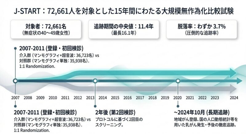 この課題を解決するため、日本国内の42施設で実施された大規模戦略研究「J-START」は、マンモグラフィに超音波検査(エコー)進行乳がんの累積罹患率が17%減少(ハザード比 0.83)したことが明らかになりました。