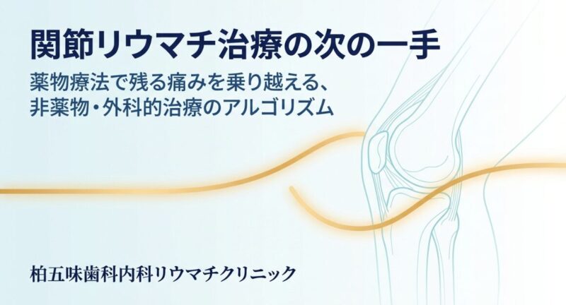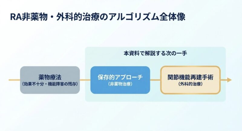 関節リウマチ(RA)非薬物治療や、適切なタイミングでの外科的治療を組み合わせた包括的な治療アルゴリズムが極めて重要となります。