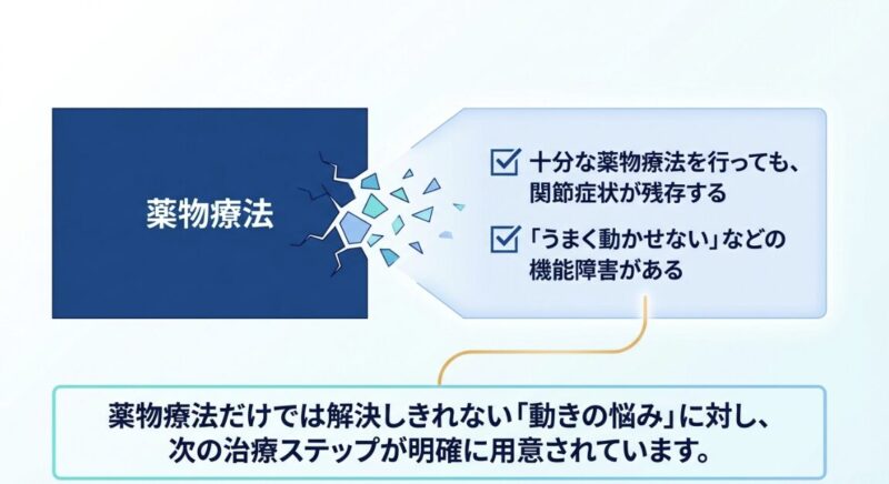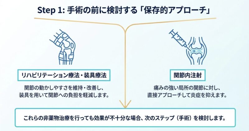 まず、薬物療法で補いきれない機能低下に対しては、リハビリテーション療法や装具療法が検討されます。これらは関節の可動域を確保し、日常生活動作(ADL)をサポートするために不可欠なプロセスです。また、少数の関節に炎症が遷延する場合には、関節内注射による局所治療が効果を発揮します。