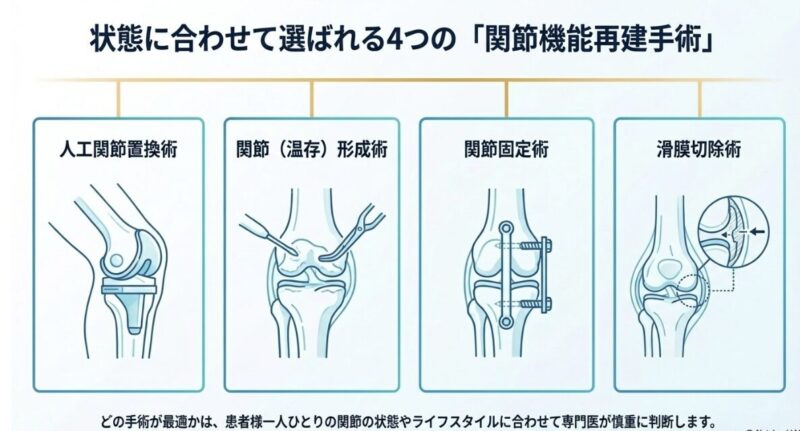 これらの治療でも改善が見られない重度の関節変形や機能障害、あるいは薬物抵抗性の頑固な関節炎に対しては、関節機能再建手術が適応となります。具体的な術式には、関節の機能を劇的に回復させる人工関節置換術のほか、関節(温存)形成術、関節固定術、炎症の元となる組織を取り除く滑膜切除術などがあります。手術を成功させるためには、術前の薬剤管理(MTXの継続など)や、術後の継続的なリハビリテーションが鍵を握ります。