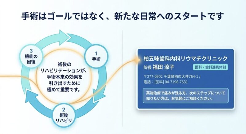最も大切なことは、RAの診断後速やかに適切な薬物介入を行う「早期治療」によって、将来的な整形外科手術のリスク自体を最小限に抑えることです。当院では、内科的な炎症のコントロールと、機能維持のための多角的なアプローチを統合し、患者様にとって最適な治療の道筋を提案しています。