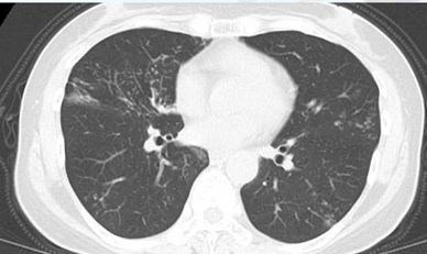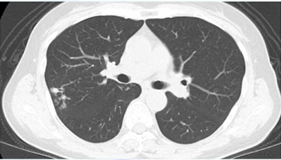 本症例は、右中肺野外側、右下肺野に粒状影を認め、NTMを疑います。