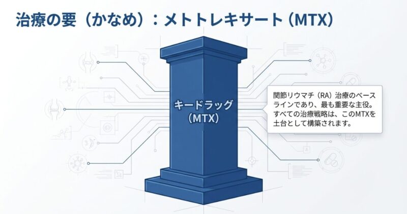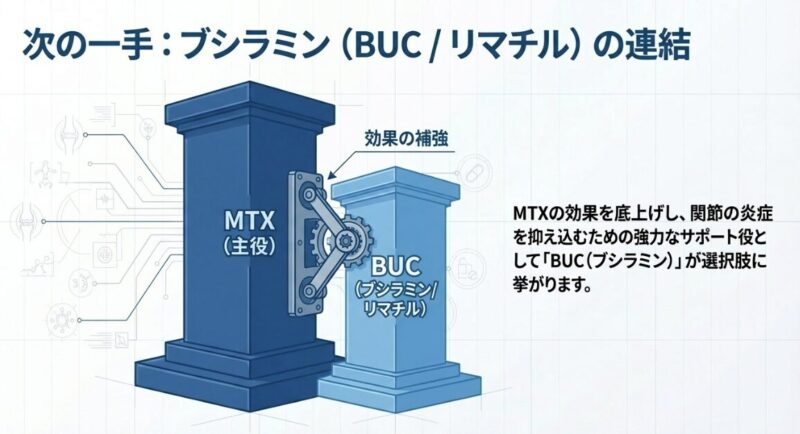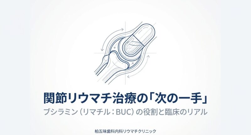関節リウマチ(RA)の薬物治療において、アンカードラッグ(基軸薬)であるメソトレキセート(MTX)の効果が十分に得られない場合、次なる選択肢として検討されるうちの一つがブシラミン(商品名:リマチル / BUC)です。ブシラミンは、免疫を調整することで関節の炎症を鎮める作用を持ち、日本国内で長年使用されてきた実績のある抗リウマチ薬です。