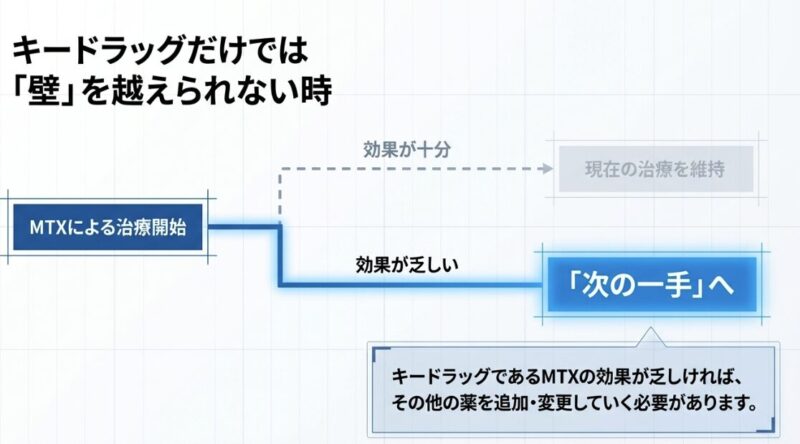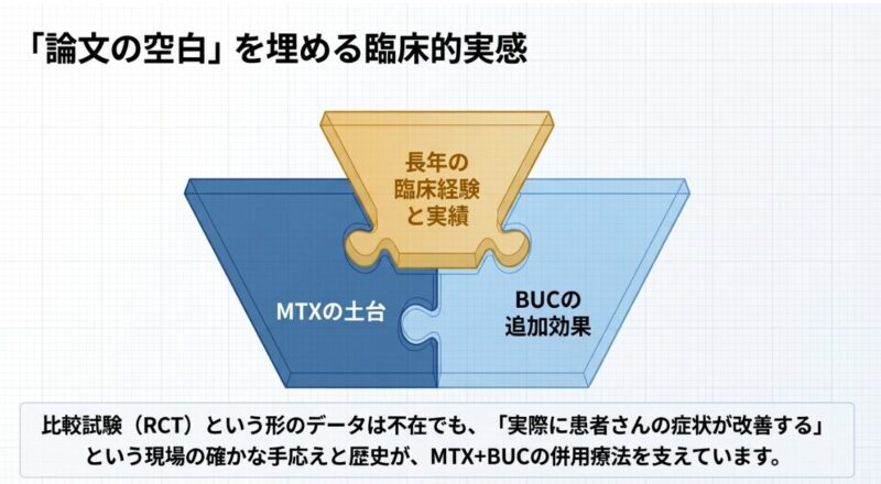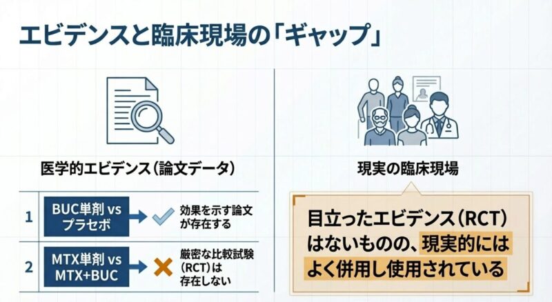 医学的なエビデンスを紐解くと、ブシラミン単剤の使用がプラセボ(偽薬)と比較して有効であることを示す論文は存在します。しかし、標準治療である「MTX単剤」と「MTX+ブシラミンの併用」を直接比較し、併用が明らかに優れていると結論づける大規模なランダム化比較試験(RCT)は、実はまだ目立ったものがありません。それにもかかわらず、実際の臨床現場ではMTXの効果を補う併用薬として高く評価されており、現在も多くの患者様に使用されているのが現状です。