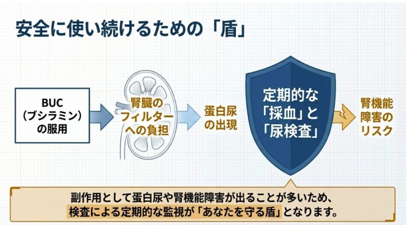 特に注意すべき副作用は、腎臓の機能に影響を及ぼすことによる蛋白尿の出現です。これは自覚症状が出にくいため、重篤な腎機能障害を未然に防ぐためには、定期的な尿検査と採血を行って慎重に経過を観察することが推奨されています。また、口内炎、皮膚の発疹、間質性肺炎などの合併症にも注意を払う必要があります。