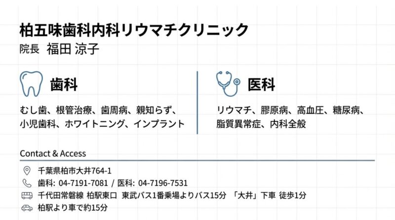 柏五味歯科内科リウマチクリニックでは、症状の背景にある「体の仕組み」まで丁寧に説明しながら、内科・リウマチ・膠原病診療を行っています。「なぜこの症状が起きるのか」を理解することを大切にしています。 柏市・我孫子市周辺で、関節の痛みや原因の分からない体調不良にお悩みの方は、どうぞお気軽にご相談ください。